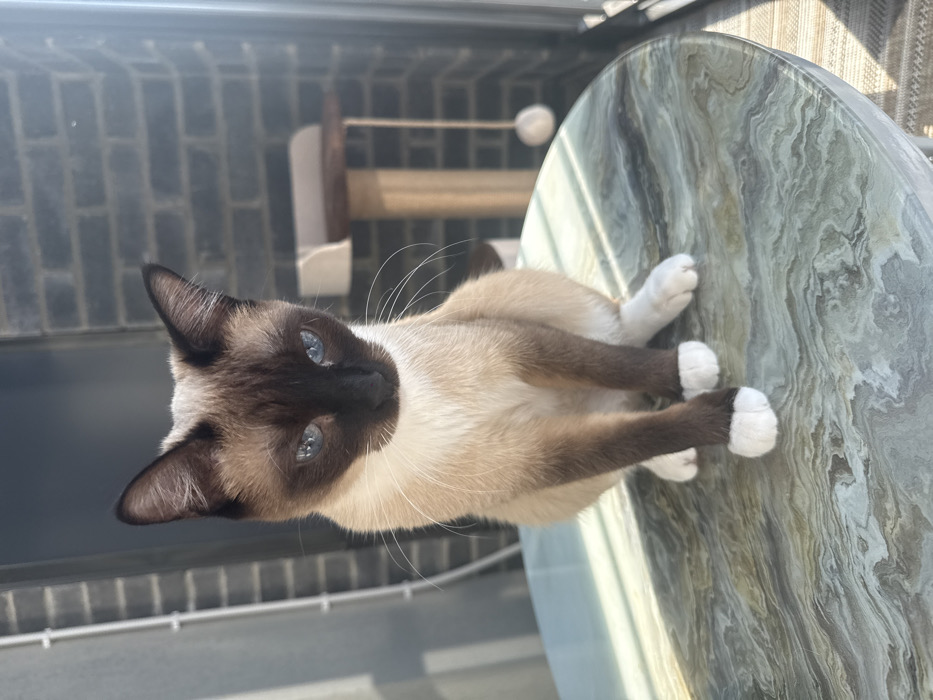 - "A domestic cat, exhibiting a colorpoint pattern with a dark brown mask, ears, and extremities, contrasting with a cream-colored body, is positioned centrally on a circular table in Perm, Russia" by FM-GBY8N2, licensed under CC BY 4.0