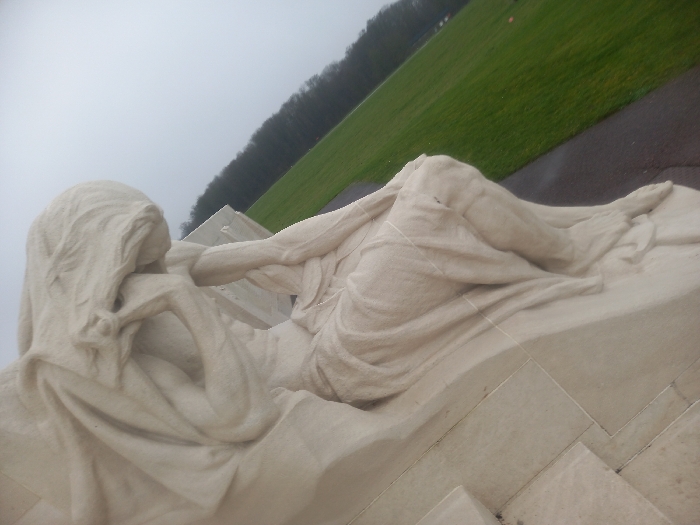 A weathered, pale stone statue of a reclining figure dominates the frame. The figure, draped in flowing fabric, rests on a tiered stone structure. Hair cascades over the face, obscuring features except for a hand raised towards the mouth. A broad, green lawn and dark trees line the horizon under an overcast sky, offering a somber backdrop to the sculpted form. The angle suggests an upward view of the statue.