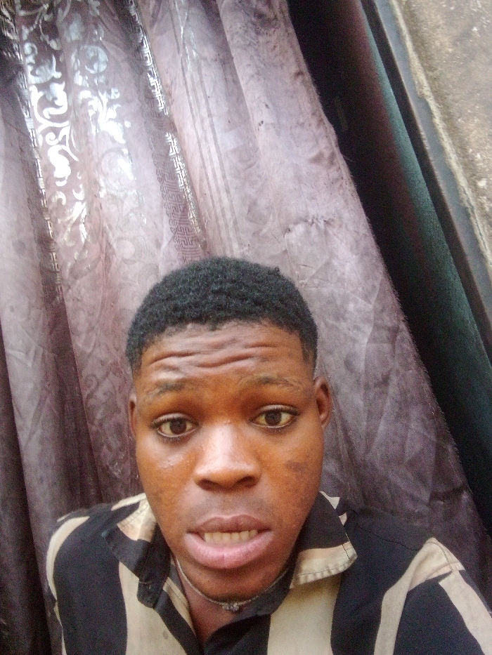 The image, captured in Akwanga, Nigeria, presents a close-up, chest-up view of a young adult male, positioned centrally