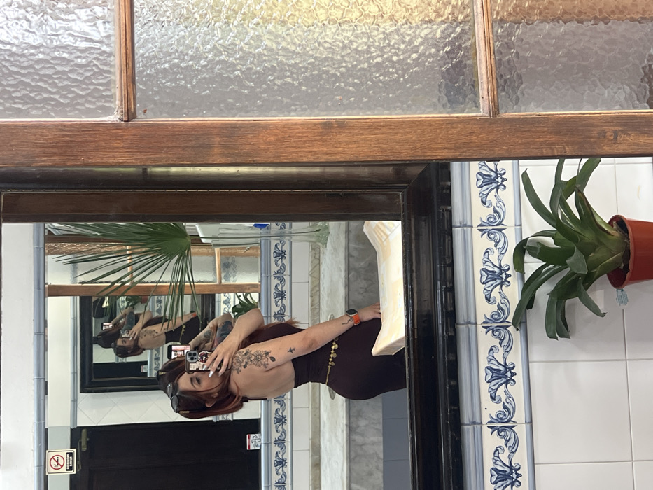 A woman is visible in a mirror, taking a selfie with her phone. She has red hair, tattoos on her arm, and is wearing a tight-fitting brown dress. The reflection shows her in a public restroom, with a white tiled wall, blue patterned tiles, and a black door. A plant in a brown pot is attached to the wall. Above the mirror is a window with textured glass and a dark wooden frame. Another mirror can be seen in the reflection.