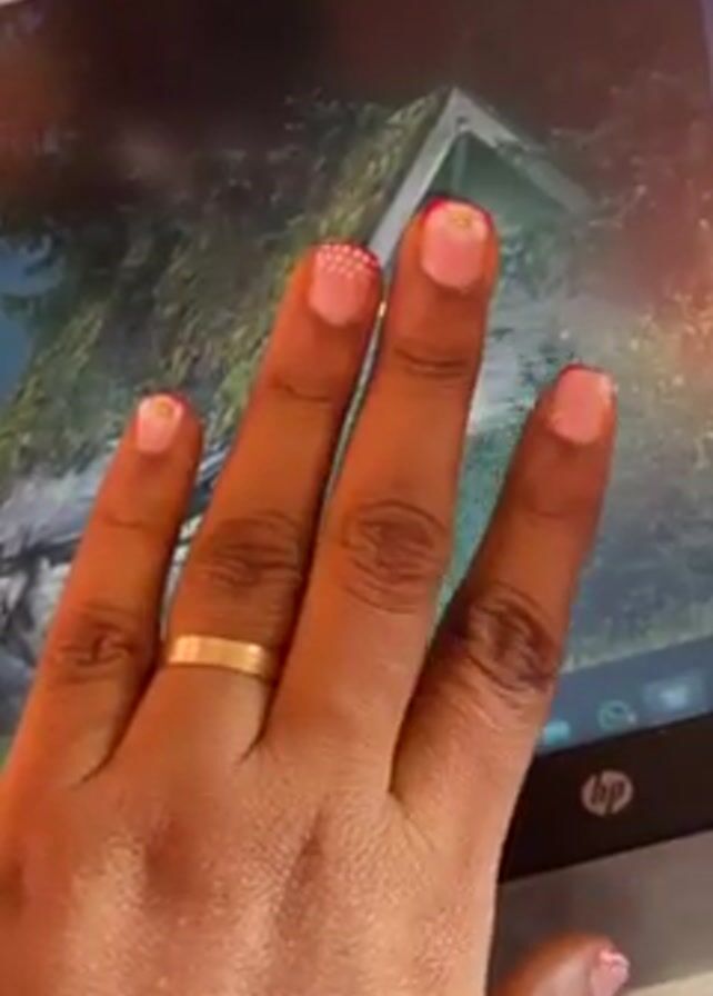 A tan-skinned hand with short nails decorated with a pink-and-white design rests on a laptop