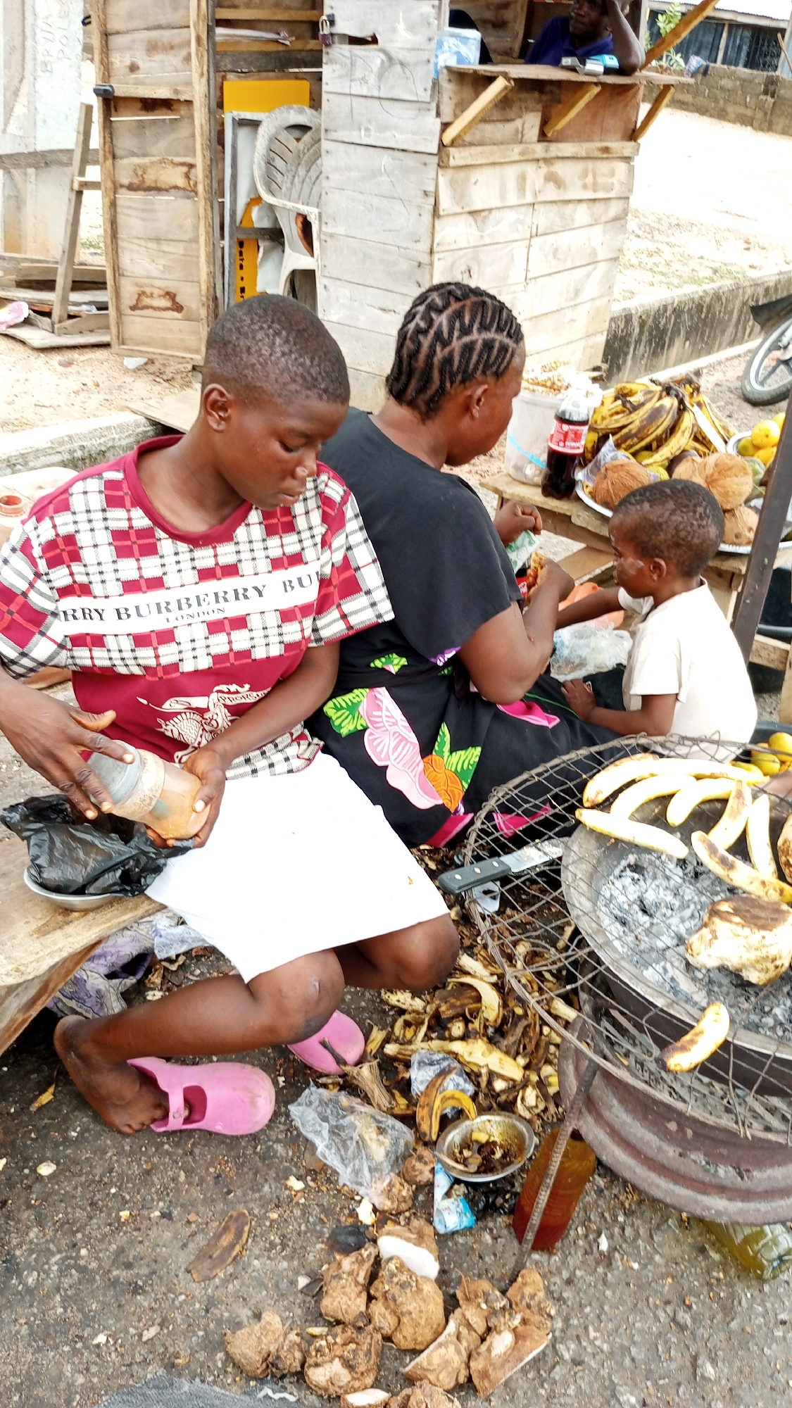 Location: Zango-ndaji, Nigeria. Scene: An outdoor food preparation and sales area. A young adult woman wearing a red and white plaid shirt with "BURBERRY" text and white shorts sits on a low surface, pouring liquid from a plastic bottle into a small container. She is wearing pink sandals. An adult woman with braided hair is seated next to her wearing a black top with a floral print skirt. A young child wearing a white shirt is also seated nearby. Objects: A metal grill with cooking bananas sits on top of a metal container. Discarded banana peels and other food waste are scattered around the grill. A pile of yam pieces lies on the ground. A Coca-Cola bottle, bananas, and coconuts sit on a table behind the group. A wooden structure is visible in the background. Actions: The young woman is preparing food. The adult woman and child appear to be eating. Bananas are being grilled. Environment: The ground is concrete and appears stained and dirty. The scene is outdoors, possibly on a roadside.