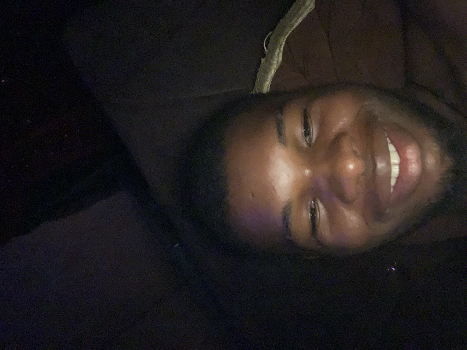 A close-up of a smiling dark-skinned man with short hair is visible in dim lighting. He is angled towards the camera and slightly tilted to the right. His teeth are visible as he smiles. The background appears to be a dark, soft surface, possibly a couch or bedding. A light-colored strap or cord is visible in the upper part of the background. The lighting on his face creates shadows, highlighting his features.