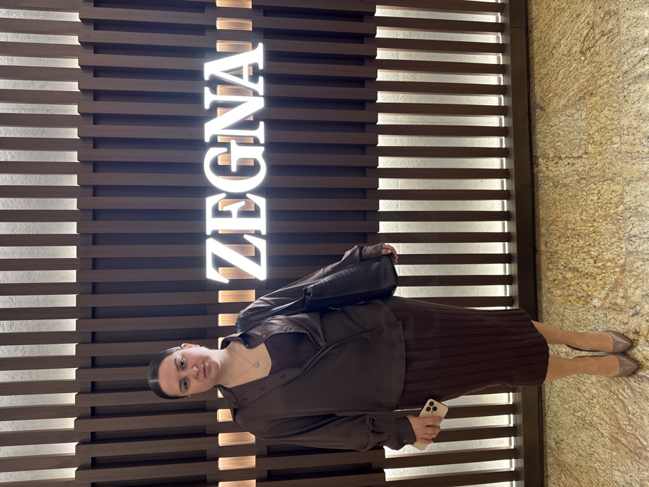 A single female subject stands centered in an indoor setting, posing for a photograph. She has dark hair pulled back and a neutral expression. Her attire consists of a dark brown long-sleeved collared shirt worn unbuttoned over a dark brown ribbed tank top, a matching dark brown ribbed midi-length skirt, and light taupe pointed-toe high heels. She wears a silver-colored necklace with a key-shaped pendant. A dark-colored shoulder bag is visible on her left side, and she holds a light-colored smartphone in her right hand. The background features a wall composed of vertical dark wooden slats, interspersed with recessed vertical strip lighting. Above the subject, a prominent, brightly illuminated white sign displays the word "ZEGNA." The floor is a textured, light brown stone. This scene is consistent with a Zegna luxury retail store, specifically located within The Dubai Mall, دبي, United Arab Emirates.