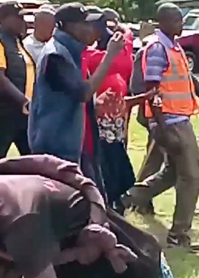 A group of people is walking outdoors on a grassy area. The people appear to be of African descent. Some of them wear colorful garlands. Several of them are wearing casual clothing such as sweatpants, t-shirts, and vests. Some of them wear baseball caps. There are several blue plastic bottles on the ground near the lower portion of the frame.