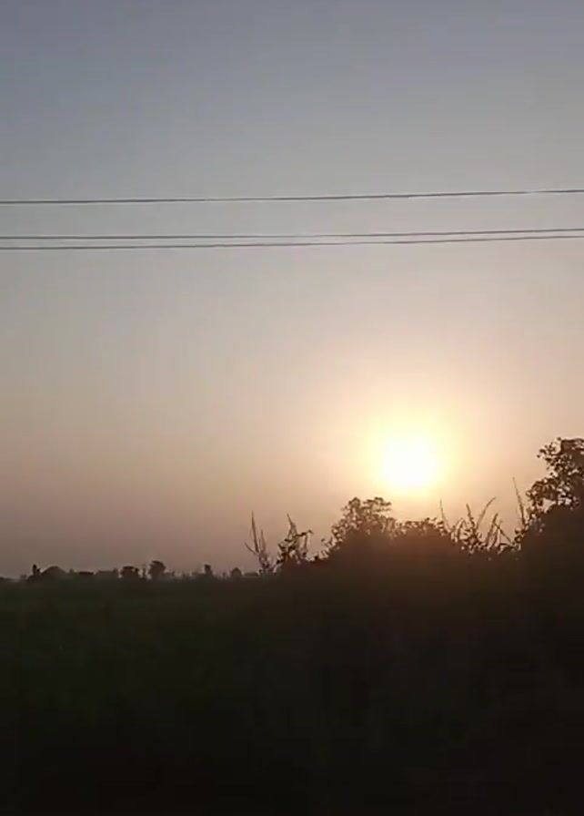 landscape at sunset, viewed from a moving vehicle. The sun is low in the sky, creating a bright spot behind trees and other vegetation. The sky transitions from a light blue at the top to a brighter, yellow-orange hue near the horizon. Power lines run across the upper part of the frame. The ground is mostly obscured by trees and shrubs, and glimpses of fields and buildings can be seen in the distance.