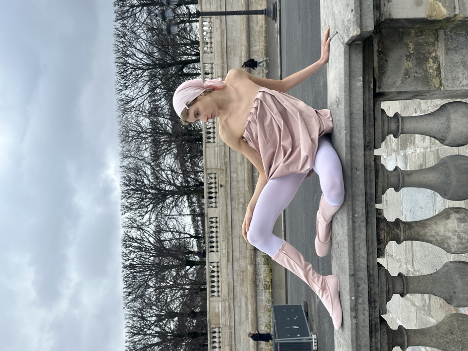 A young individual is seated on a grey stone balustrade in a public area of Paris, France, characteristic of a location near the Seine or a prominent garden like the Tuileries. The subject, appearing female, is posed with her body angled right and her head turned left, gazing into the distance with a neutral expression. She wears a light pink strapless top, draped with folds, paired with white opaque tights. Light pink, flat-soled, knee-high boots with outer zippers cover her feet and lower legs. A matching light pink headscarf, secured with a small light-colored clip, covers her hair. Her left leg is extended forward with the foot pointed, while her right leg is bent with the foot positioned near the left. Her left hand rests on her left thigh, and her right hand supports her weight on the balustrade behind her. Behind the foreground balustrade, a wide, light-colored stone wall forms a barrier. Beyond this wall, a paved surface is visible where two distant figures in dark clothing walk. To the far left, a grey and black temporary metal barrier is partially seen. The background features a linear arrangement of bare, deciduous trees with intricate branch patterns, set against an overcast, grey sky. A black, classical-style lamppost with two light fixtures is visible on the right side of the frame, behind the tree line. The overall lighting is diffused, indicating a cloudy day.