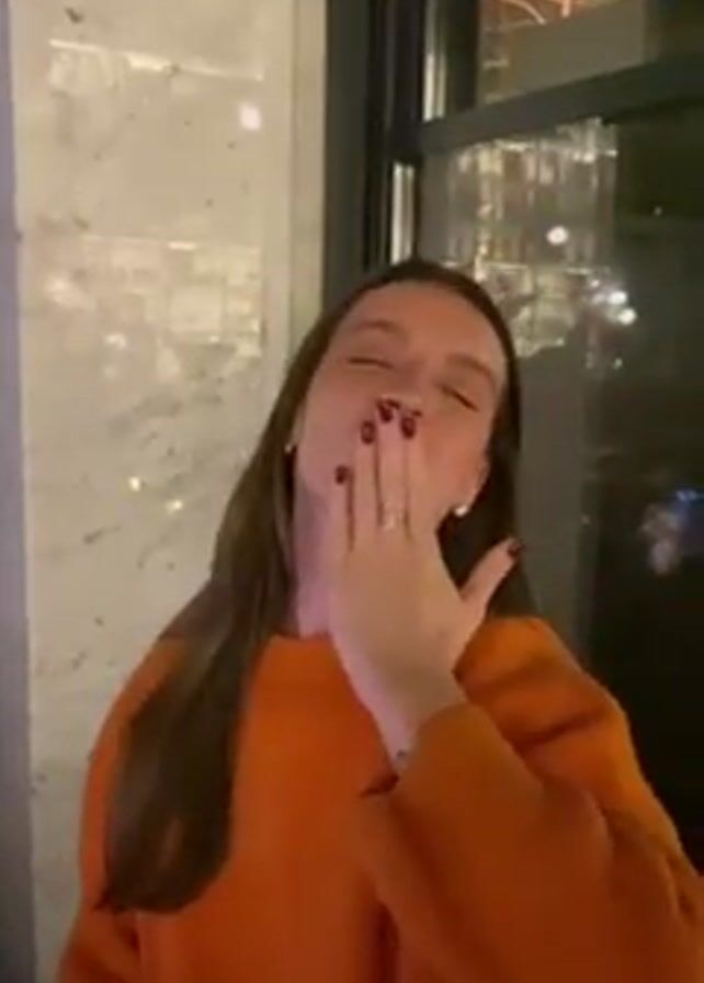 A young woman in an orange sweater stands indoors, next to a wall with a marble-like pattern, near a window, and dances to music. The woman has long, brown hair. She blows a kiss towards the camera, smiles, and shakes her head, flicking her hair. Outside the window, lights suggest a nighttime cityscape.