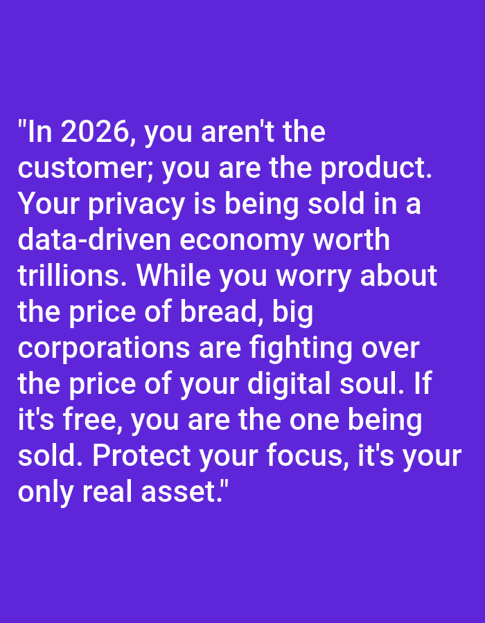 This digital image displays white text centrally aligned on a solid purple background. The text reads: "In 2026, you aren't the customer; you are the product. Your privacy is being sold in a data-driven economy worth trillions. While you worry about the price of bread, big corporations are fighting over the price of your digital soul. If it's free, you are the one being sold. Protect your focus, it's your only real asset." No people, physical subjects, objects, or actions are depicted. The image is a graphic; therefore, no physical location in the city of Unknown, Unknown is represented.