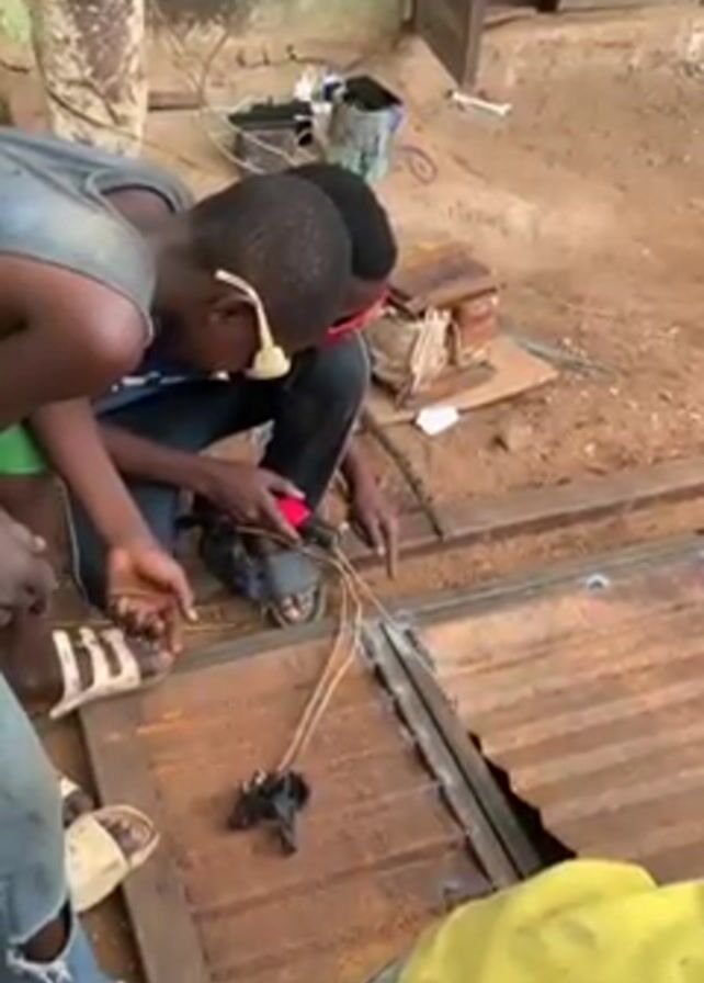 Two young men are welding a metal structure, possibly a door or gate. One man is crouched down, holding a red welding tool and wearing safety goggles and sandals. The other man is standing next to him, also wearing sandals, with his arm extended towards the welding area, possibly giving instructions or monitoring the work. The structure being welded has a rusty, corrugated metal sheet inside a metal frame. The work area appears to be outdoors, with a building in the background and some equipment and debris scattered around.
