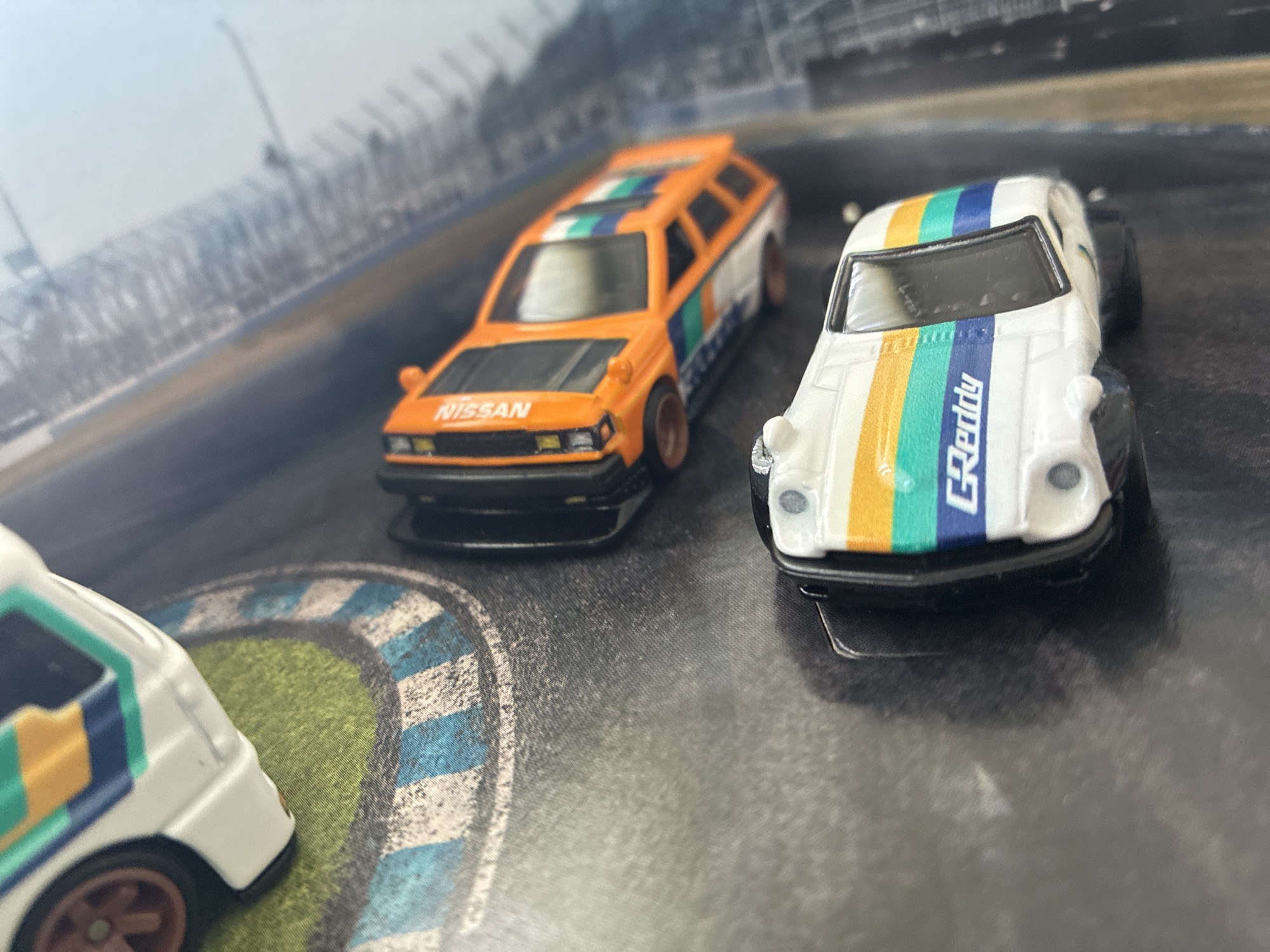 The image displays a close-up perspective of three miniature model cars arranged on a simulated race track diorama. In the midground, an orange station wagon model, bearing "NISSAN" lettering on its hood, features white, teal, blue, and orange racing stripes on its roof and side panels, equipped with dark bronze wheels. To the right, a white coupe model, characterized by wide black fender flares, presents green, blue, and orange longitudinal racing stripes across its hood and roof, with "GReddy" text visible on the hood; this vehicle has black wheels. A third white model car is partially visible in the bottom-left corner, showing its rear section with similar racing stripes and a dark bronze wheel. The miniature track surface is dark grey, textured to resemble asphalt, and includes a distinct white and blue striped curb delineating a corner, next to a textured green area simulating grass. The background is a blurred photographic print depicting elements of a race circuit, possibly grandstands or safety fencing. This scene represents a miniature display and does not depict any actual location within the city of Plovdiv, Bulgaria.