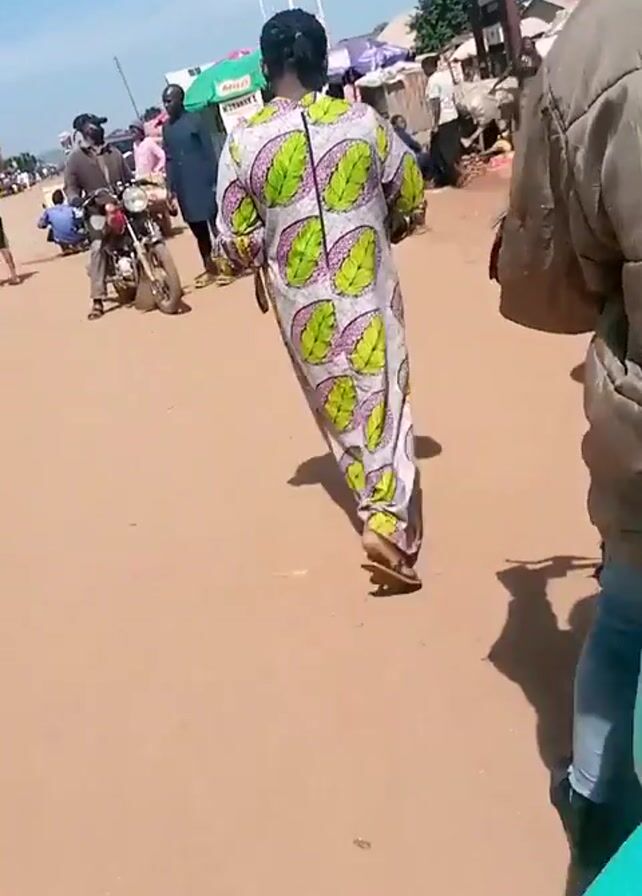 bustling outdoor market scene. A woman in a long, patterned dress walks away from the camera, surrounded by other people. Some are walking, some are riding motorcycles. Stalls and umbrellas suggest vendors selling goods. The ground appears to be dirt. The weather seems sunny.