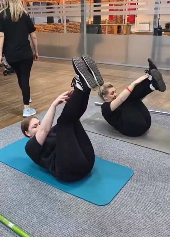 Two women lie on yoga mats in what appears to be a gym or fitness studio, performing abdominal exercises