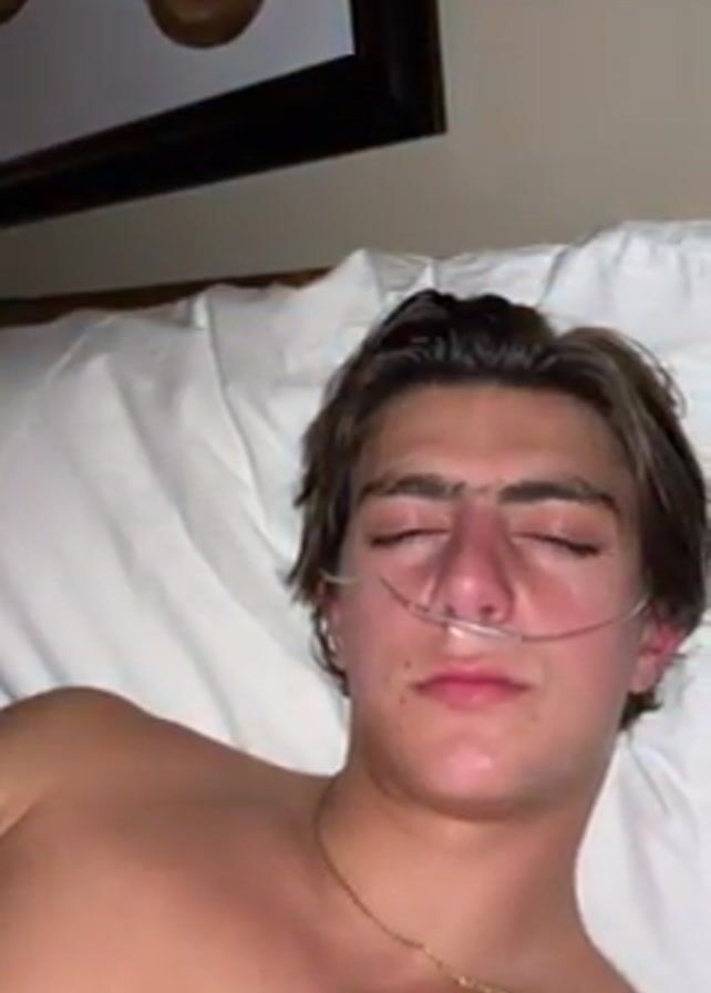 A young man lies in bed, shirtless, with a nasal cannula in his nostrils
