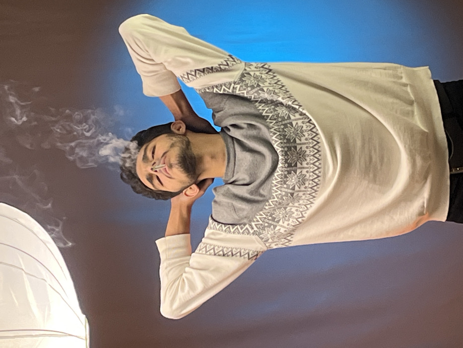 A young man tilts his head back, exhaling smoke from a cigarette or joint in his mouth. He wears a long-sleeved shirt with gray and white sections decorated with geometric patterns. His hands are raised, supporting the back of his head. The background transitions from brown to blue. To the left, a softbox light is visible.