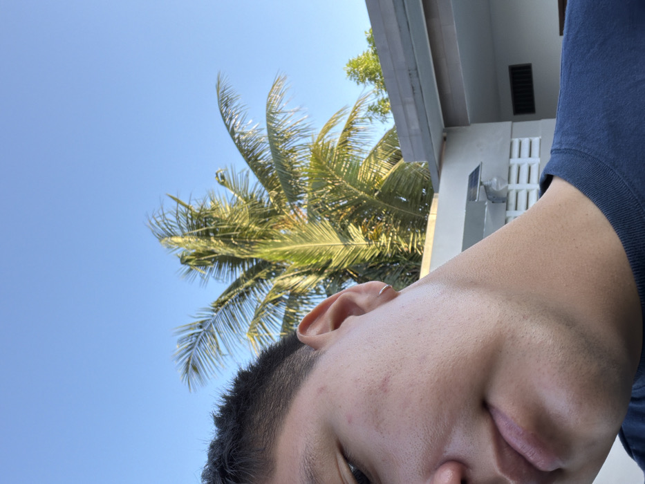 A low-angle shot features a person against a backdrop of blue sky and a palm tree. The individual's face, ear with a ring, and short dark hair are prominently displayed. Part of a building is visible behind the tree. The person wears a dark blue shirt. The perspective is slightly off-center, emphasizing the sky and tree against the close-up of the person's face.