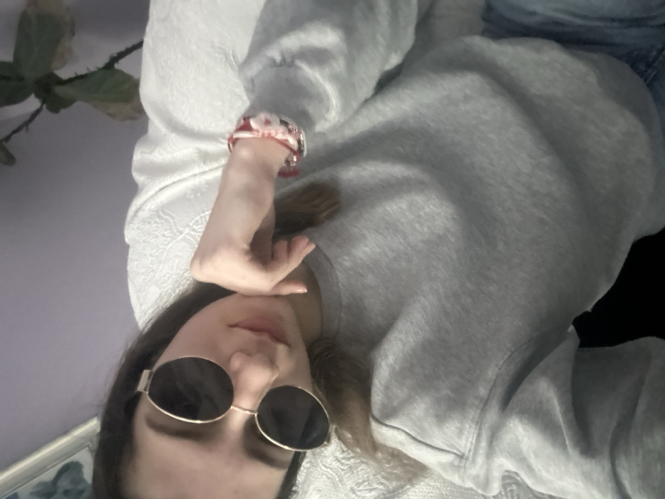 A female individual is depicted in an indoor setting, likely a residence located in the city of Ruse, Bulgaria. The individual is positioned reclining or lying down, with her head tilted slightly. She wears round, dark-lensed sunglasses with thin, gold-colored metal frames and a double bridge. Her facial expression shows a faint smile, with her mouth slightly closed. Her left hand is raised, with fingers gently curled, resting near her chin or jawline. She is wearing a plain grey long-sleeved sweatshirt. On her right wrist, a multi-strand bracelet consisting of red and white woven or braided material, possibly fabric or cord, is visible, along with a small silver-colored metal component. The background on the left features a light purple wall or surface, with a corner of a framed item displaying a blue and white pattern. To the right, a large green houseplant with broad leaves, some appearing discolored, is partially visible. The individual is resting on or against a white, textured fabric surface, possibly a blanket or upholstery. A small portion of blue denim fabric, consistent with jeans, is visible in the lower right corner. The scene is evenly lit with ambient light.