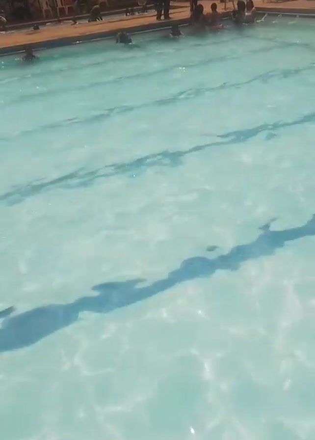 rectangular, turquoise-colored outdoor swimming pool on a sunny day. A number of people, mainly children, are enjoying themselves in the pool, some swimming and others splashing. Along the pool's edge, a few individuals, including adults, are standing or sitting, watching the swimmers. A building with a balcony runs alongside one edge of the pool. Chairs are visible on the building's patio. The camera remains relatively still throughout the recording.