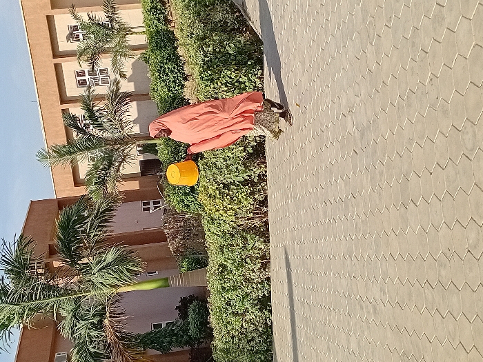 The scene depicts a single individual walking outdoors on a paved surface in Kwazailewa, Nigeria. The person, appearing female, is dressed in a long, coral-pink or peach-colored hijab or abaya covering most of their body, with a patterned lower garment visible above their feet. They are holding a bright yellow plastic bucket in their left hand, extended slightly away from their body as they move from left to right across the frame. The paved ground consists of light-colored, interlocking hexagonal or zigzag-shaped pavers. Behind the pedestrian is a dense, well-maintained hedge of green shrubs. In the background, several multi-story buildings with light brown or beige facades and multiple rectangular windows are visible. Tall palm trees are interspersed among the buildings and shrubs. The sky is clear and blue, indicating daylight, with strong illumination casting shadows to the right of objects.
