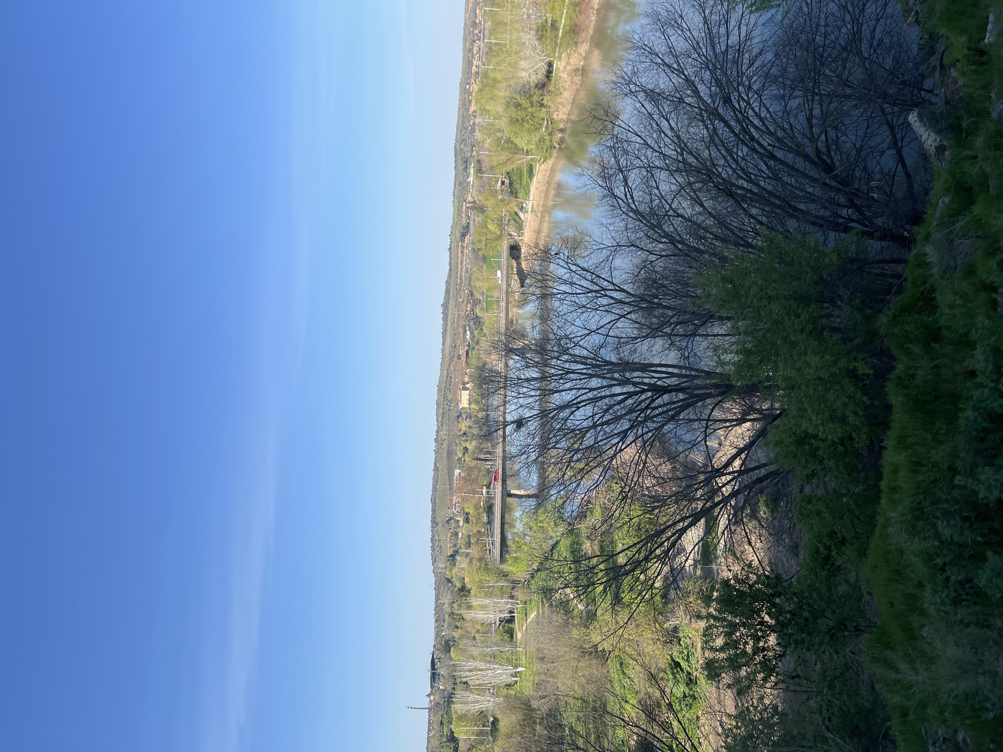 An elevated panoramic view captures the Tagus River flowing through a verdant landscape under a clear, bright blue sky in Toledo, Spain. In the foreground, dense, dark green foliage and the intricate, bare branches of several deciduous trees partially obscure the immediate riverbank. The Tagus River, reflecting the bright blue sky, dominates the midground, flowing from left to right. A multi-arch concrete road bridge spans the river; a red sedan is observed traversing its deck from left to right. A white van is visible on a road further to the right, on the far bank. The riverbanks are lined with diverse vegetation, including trees with budding green leaves, others still bare, and visible dirt paths. In the distant background, rolling hills covered with sparse greenery support scattered urban structures and a prominent, tall, dark-colored communication tower on the left horizon. The scene is illuminated by bright daylight, casting distinct shadows, indicative of a sunny day. No individuals are explicitly visible.