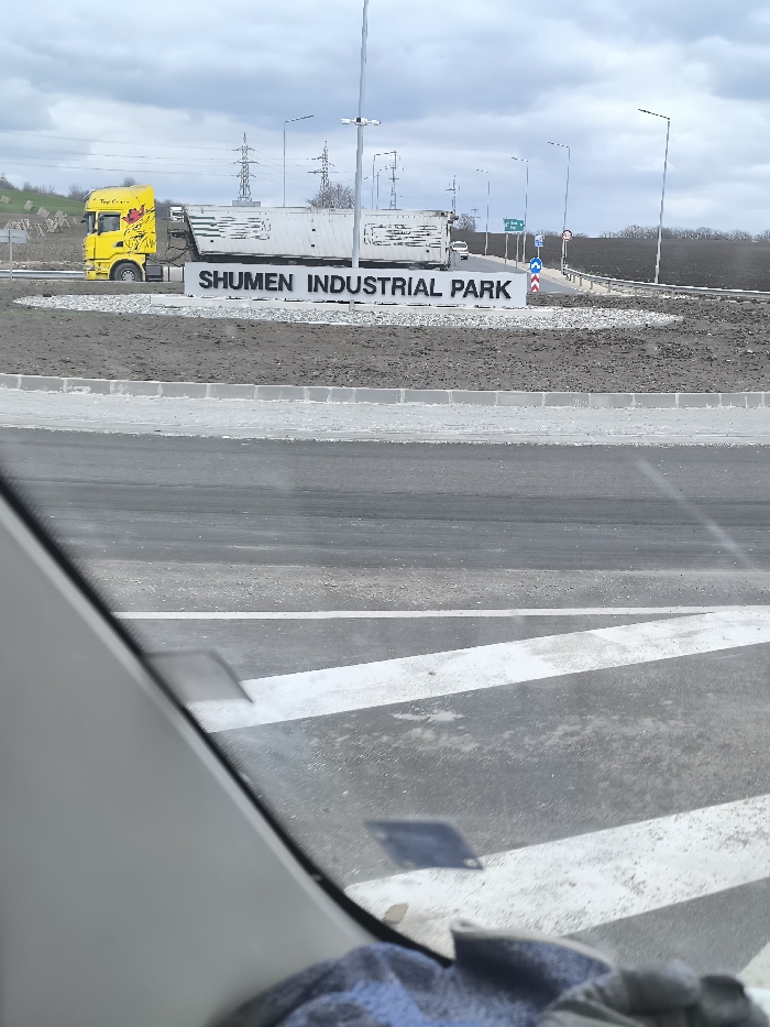 The image captures an exterior scene at the entrance of the Shumen Industrial Park in Shumen, Bulgaria, viewed from inside a vehicle on an overcast day