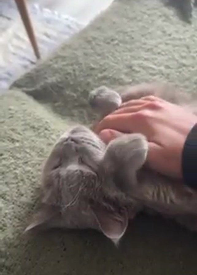 A hand rubs a gray cat's face