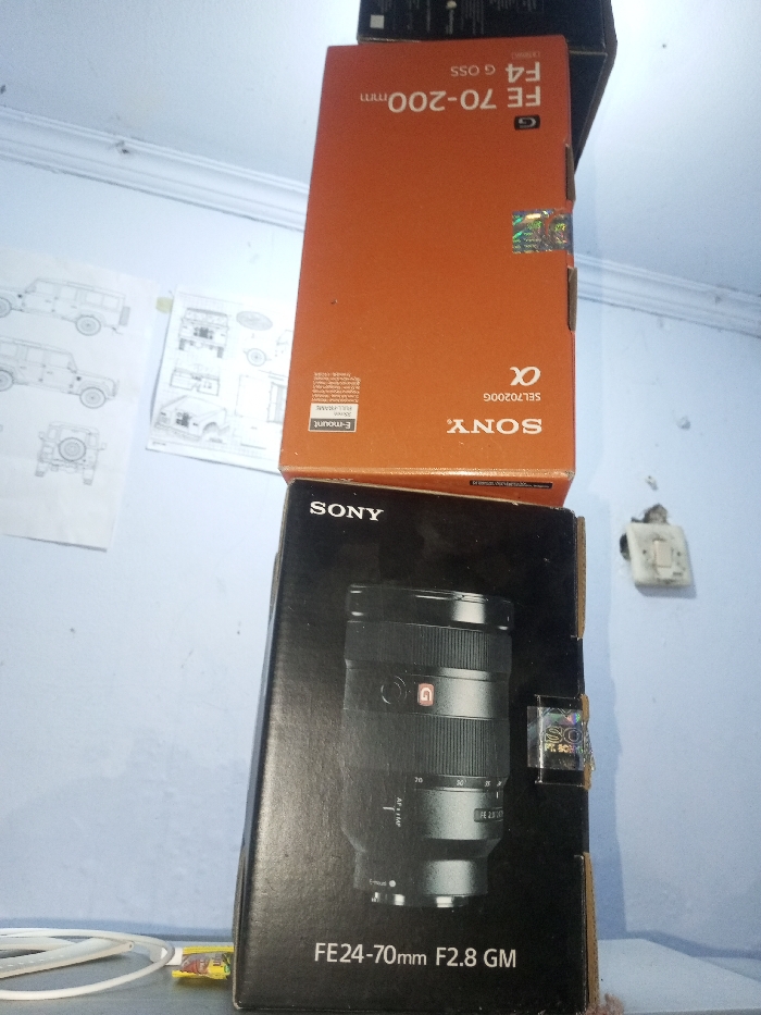 A stack of Sony lens boxes leans against a wall. The bottom box is black, showing a picture of a Sony FE 24-70mm F2.8 GM lens. Above it, an orange box advertises a Sony FE 70-200mm F4 G OSS lens with the alpha logo. A white light switch is visible on the blue wall in the background. To the left, a poster displays technical drawings of vehicles. A white wire and a small, colorful object are on the surface in front of the boxes.
