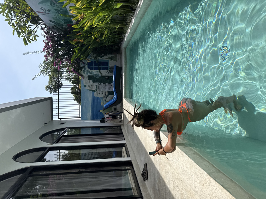 A woman in an orange bikini is partially submerged in a narrow swimming pool, looking at her phone. Her dreadlocks are pulled back from her face. A white building with arched windows is to the left. The pool area is decorated with greenery, and a mural of a blue and white seascape adorns a wall. The pool water is clear and reflects the sunlight.
