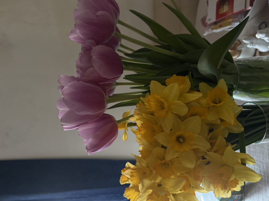 The image presents an indoor scene located in Leninakan, Russia. On a light-colored surface, two bouquets of cut flowers are displayed in clear glass vases. The left vase holds a dense arrangement of bright yellow daffodils, characterized by their prominent orange-yellow central coronas. The right vase contains several vibrant purple-pink tulips with visible green stems and leaves. The flowers are brightly illuminated, likely by natural light, originating from the left. The background consists of a plain, light-toned wall. A dark blue curtain or drape is partially visible along the far left edge of the frame. On the right side of the background, partially obscured on a shelf or surface, are several small, indistinct objects, including two white ceramic figurines, one larger and one smaller, resembling rabbits, and a red and white package. No individuals are present in the image.