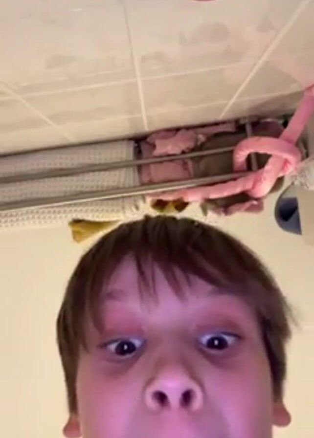 A young boy is holding a camera at an unusual angle, pointing up towards the ceiling. The camera captures his face from below, focusing on his eyes, nose, and mouth. His expression changes as he speaks. Behind him, the ceiling is visible, along with a shower curtain rod and some items hanging on it, including a pink object. A pink bottle is also visible in the corner. The overall environment appears to be a bathroom.