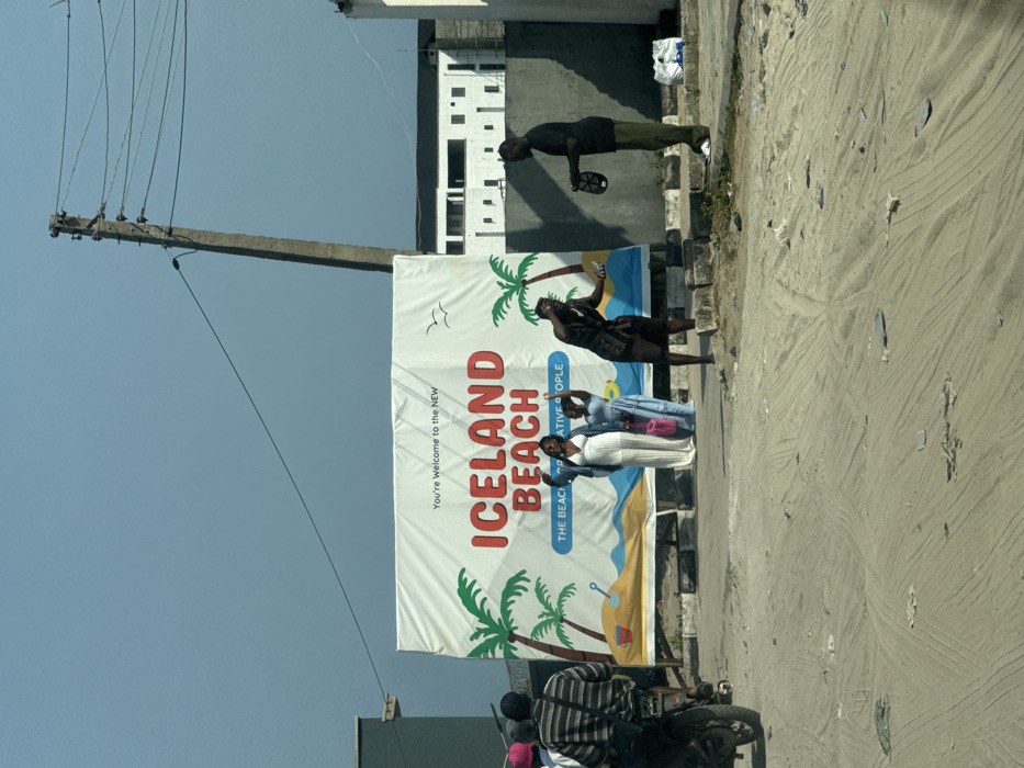 This image depicts an outdoor scene in Mopo-Akinlade, Nigeria, characterized by an unpaved, sandy-dirt ground with tire tracks and debris. In the center, a large white billboard prominently displays "You're Welcome to the NEW ICELAND BEACH" with an illustration of palm trees, a beach, a sandcastle, and seagulls. The billboard is supported by concrete blocks at its base. Five individuals are visible: 1. On the far left, the upper torso of a person in a striped shirt is seen from behind, seated on a motorcycle. 2. To the left of the billboard's center, a woman in a long, light-colored dress or jumpsuit stands, holding a pink bag in her left hand, with her right arm raised. 3. Slightly behind and to the right of the first woman, a second woman in a light blue dress also stands with her right arm raised. 4. To the right of the two women, a man in a dark, patterned short-sleeved shirt and dark shorts stands with both arms raised and bent at the elbows, hands open, in an expressive gesture. 5. Further right, a second man in a dark t-shirt and olive-green trousers faces the expressive man, holding a dark, possibly mesh, circular object in his left hand. In the background, a tall, grey utility pole with multiple dark wires stands to the right of the billboard. Behind the pole, a white multi-story building with dark windows is visible, along with a dark grey concrete wall closer to the foreground. The sky above is clear and light blue.