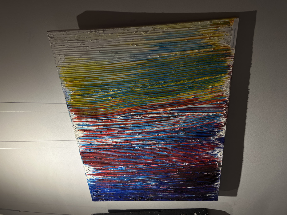 An abstract, rectangular painting is horizontally suspended by thin, translucent wires against a smooth, light gray wall in an exhibition space in Yerevan, Armenia. The artwork features a highly textured surface, with thick impasto paint applied in numerous vertical, slightly diagonal ridges that create a pronounced three-dimensional effect. Colors progress from dark blues and purples on the far left, transitioning through various shades of red, light blue, and yellow, culminating in white on the far right. An overhead spotlight illuminates the painting from the left, casting a dark, defined shadow onto the wall below and to the right of the artwork. A small white informational label is partially visible at the bottom right edge of the painting. A sliver of another dark, textured artwork is visible on the extreme left periphery of the frame. There are no individuals present in the scene.