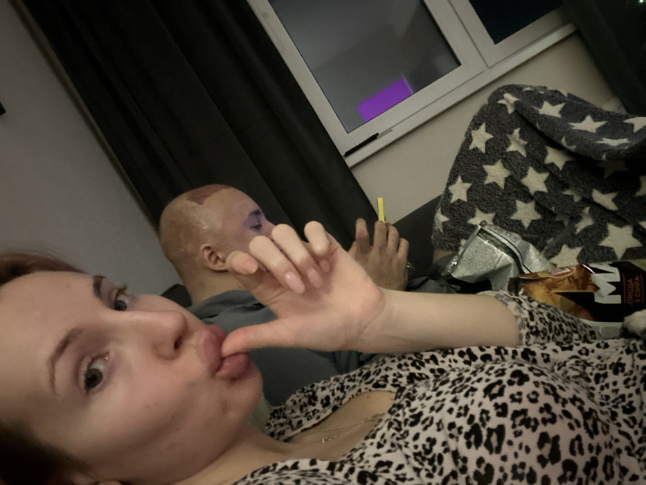 A couple relaxes indoors, possibly watching TV. A woman with red hair and a cheetah print shirt is in the foreground, posing suggestively with a finger in her mouth. Behind her, a bald man sits with a straw in his hand. A blanket with white stars on a dark background is draped over the back of the sofa, along with a bag of chips. A window with dark curtains is visible in the background.