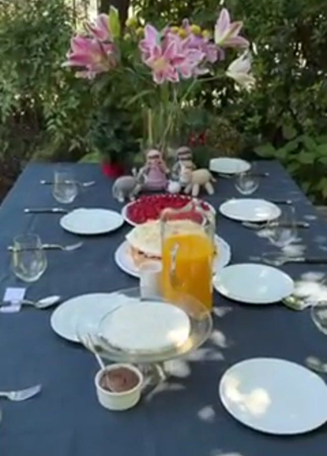 neatly set table in a garden. The table is covered with a blue cloth and set for eight people, with white plates, cutlery, and glasses at each place setting. In the center of the table, there is a large vase filled with pink lilies. Several food items are arranged around the vase, including a pitcher of orange juice, a plate of raspberries, and a meringue dessert. There is also a small bowl of what appears to be chocolate spread and a dish of white shredded coconut. Between the lilies and food items, there are four small knitted figures, including two figures resembling people and two figures resembling animals. The garden is lush and green, with trees and bushes visible in the background.