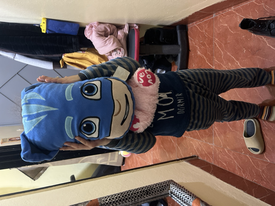A child wearing striped pajamas holds a blue PJ Masks plush toy. The child also has a pink stuffed animal. The room is indoors and appears to be a hallway. There are shoes on the floor near the child, and miscellaneous items on a shelf in the background. The floor is red tile.