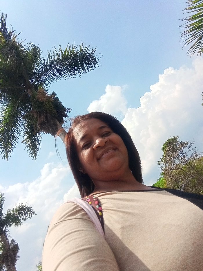 A single adult female is depicted in an upward-angled selfie, smiling directly at the camera. She has medium-toned skin and dark, straight hair, which appears reddish-brown near the roots. She is wearing a light tan or beige long-sleeved top, with a segment of black fabric visible on her right side (viewer's left shoulder and arm). A multicolored strap, featuring pink, white, brown, and black polka dots, is visible over her left shoulder, suggesting a bag or backpack. The background consists of a bright blue sky with scattered white cumulus clouds. Multiple tall palm trees with green fronds are prominent, primarily in the upper left quadrant of the frame, with additional palm fronds visible in the upper right and lower left. Other deciduous trees with green and brown foliage are visible on the far right side of the image. The scene is set outdoors under bright daylight conditions in what is identified as La Victoria, Venezuela.