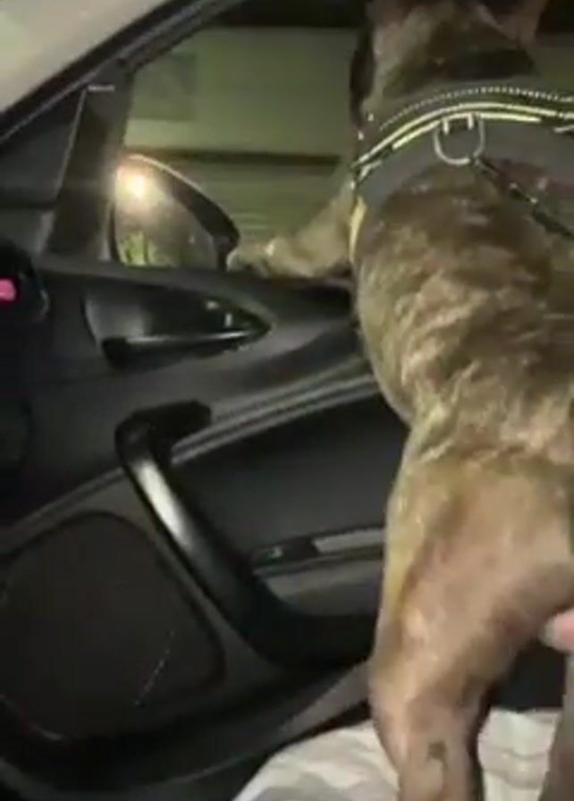 A brindle French bulldog wearing a harness stands on a white-and-grey striped cushion inside a car, with its paws resting on the interior door panel. The car door is black, with a silver handle and trim. The dog looks out the open car window, towards a building with lights. The video is shot from inside the car, looking up at the dog. The scene is dimly lit. Background music plays.