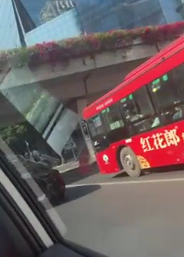A car is driving on a city street. In the first few seconds, a red bus drives by. Then, a black car follows. A white car is also seen. Buildings and trees are visible as well.