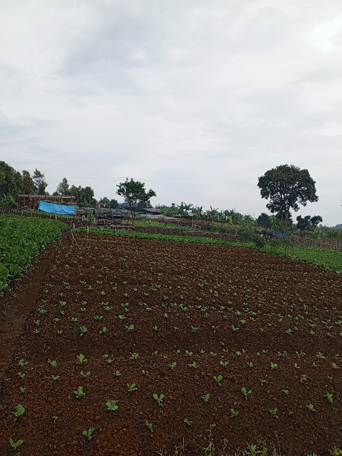 A vast field of young plants covers the foreground, rising to a horizon of trees, foliage, and rustic structures. A blue tarp is visible among the buildings. The soil is rich and dark brown. Above, the sky is overcast with a blanket of gray clouds, muting the colors of the landscape. A large tree stands prominently on the right side of the scene, contrasting with the smaller vegetation.