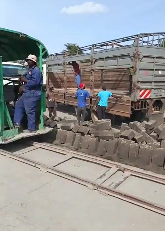 scene outdoors during daylight with a blue sky and scattered clouds. A man in a blue jumpsuit and a hat stands on a green, flatbed, railcar-like vehicle with a small enclosed cabin. The vehicle is positioned on what appears to be a narrow-gauge railway track. A pile of large, rectangular, gray blocks lies beside the track. To the right of the railcar is a gray truck with an open bed. Several men are either standing in the truck bed or assisting from the ground. One man is wearing a red shirt, another a blue shirt, and another a teal shirt. The truck's bed is also partially filled with the same type of gray blocks. The man on the railcar is looking down at something in his hands. The overall impression is that the men are loading or unloading the gray blocks from the truck, possibly using the railcar for transport.