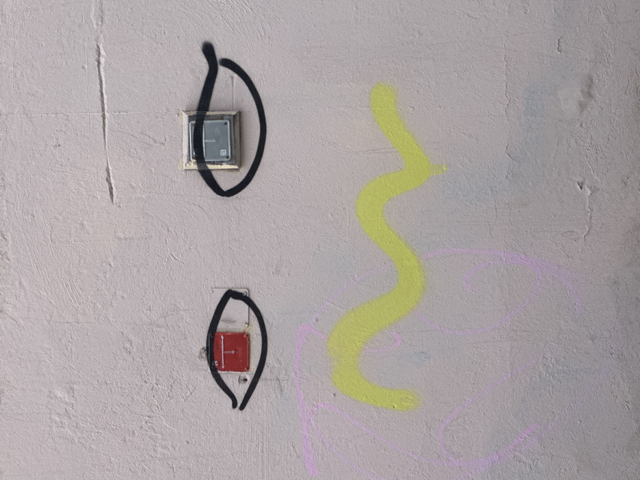 A textured, light beige-grey wall, located in Vilnius, Lithuania, serves as a canvas for graffiti art. The wall surface exhibits minor cracks, scuffs, and areas of discoloration. Two distinct electrical fixtures are integrated into the wall, positioned horizontally. The left fixture is a red rectangular box with a white 'T' symbol, secured to a lighter rectangular base plate. This fixture is encircled by a black spray-painted outline shaped like an eye, featuring a prominent upper lid line extending to the left. The right fixture is a square, light-colored electrical component with a dark grey face, possibly a sensor or grille. This component is similarly enclosed by a black spray-painted outline resembling an eye, with a more elongated and stylized upper lid curve extending to the right. Below the two 'eyes', a thick, sinuous line of neon yellow spray paint forms a horizontal wave, suggestive of a mouth. Faint, thin lines of purple spray paint are visible lower on the wall, beneath and to the left of the yellow graffiti, indicating multiple layers of application or earlier tagging. No individuals are present in the scene.