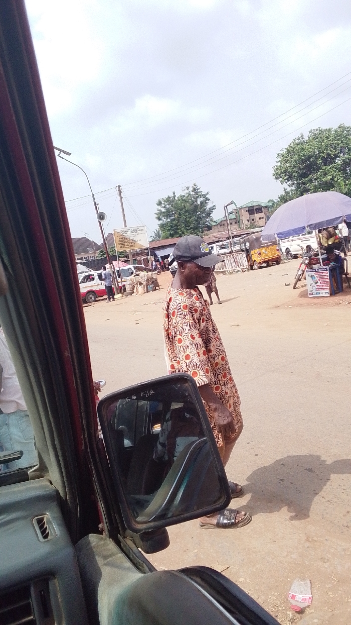 The image depicts a street scene in Igbo Ukwu, Nigeria, viewed from inside a stationary vehicle