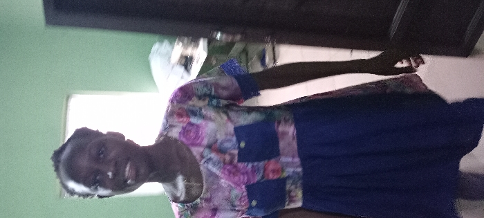This image depicts a young female subject standing indoors in Aba, Nigeria. The subject possesses a dark complexion, with dark hair pulled back. She is attired in a knee-length dress featuring a floral-patterned upper section predominantly in shades of pink, purple, and green, with a round neckline and short sleeves detailed with blue trim. The upper section incorporates two prominent dark blue square pockets, each adorned with a small light-colored button near its top. The lower section of the dress is a solid dark blue. A thin necklace with a small pendant is visible around her neck. The subject is smiling and looking directly towards the camera. Her right arm is positioned alongside her body, with her hand adjacent to a dark brown door frame visible on the right side of the frame. The background consists of light mint green painted walls, a bright window providing ambient light in the upper left quadrant, and indistinct furniture or objects further within the room, including a white surface and metallic elements. The floor is light-colored and not clearly discernible.