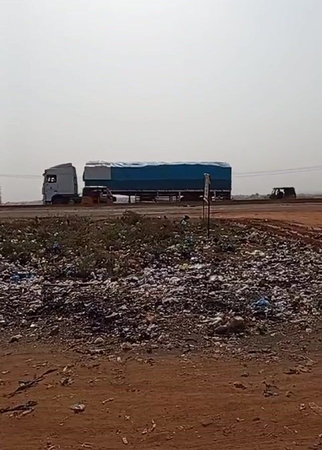 The scene is a roadside area with a significant amount of trash and debris scattered across the foreground. The ground is red dirt. In the background, a road stretches across the scene with multiple large trucks passing by. The sky is hazy. The video is shot during daylight. A watermark indicates the video was taken on an "Infinix HOT 50i" device. There are no people visible in the video.