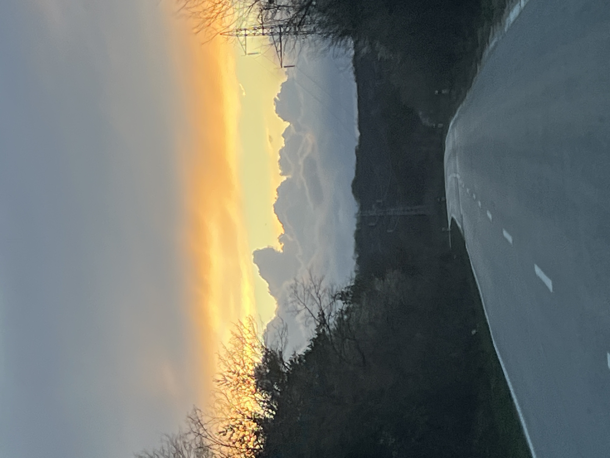 road in Gardevtsi, Bulgaria, with trees lining the roadside. The sky is a mix of orange and gray, likely indicating sunrise or sunset. An electricity pylon is visible in the background. There are no people visible. The road is asphalt, with white line markings.