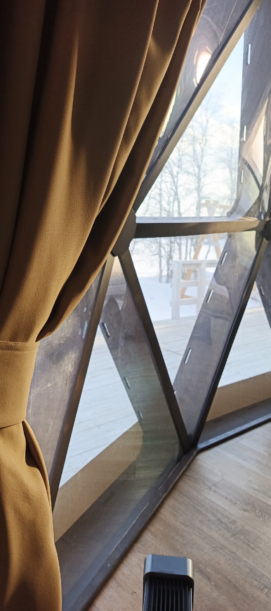 A close-up indoor shot shows a brown curtain partially obscuring a geodesic-style window with a dark frame. Outside the window is a snow-covered landscape, with bare trees and a white picnic table visible in the distance. The floor inside has a wood-like pattern. In the foreground, near the base of the window, is a small, dark object with vertical slots. The scene is illuminated by natural light. The precise location in Iskateley, Russia, cannot be determined from the provided image.