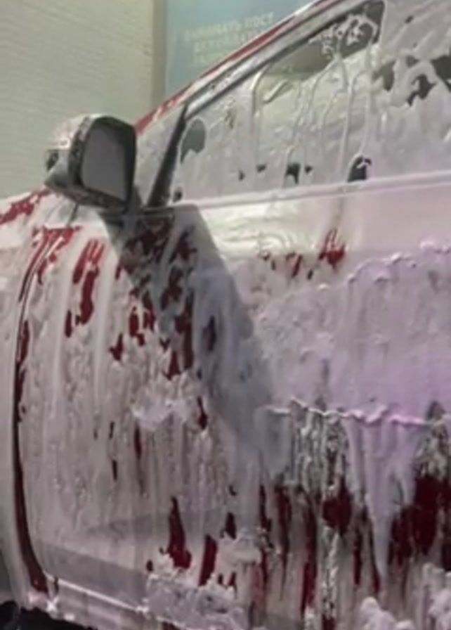 A red car is covered in white foam at a car wash. The foam is thick and covers much of the door and side mirror. Some of the red paint of the car is visible through the foam. The car is inside, and there appears to be a sign on the wall.