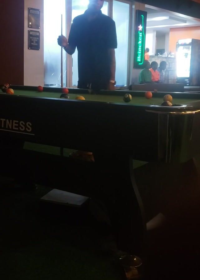 In a dim bar, a man prepares to play pool on a table adorned with colorful balls. He's silhouetted against the bright windows, a cue stick in hand. The pool table itself is the focal point, branded with "FITNESS" on its side. Beyond the windows, patrons sit at tables inside the bar. A Heineken neon sign glows, advertising the beer brand. The green floor adds a touch of color to the otherwise dark ambiance.