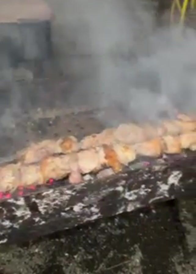 meat skewers grilling over a smoky fire. The skewers are lined up on a makeshift grill, possibly fashioned from a log or other rough material. Hot coals glow underneath, producing significant smoke. The meat appears to be chunks, possibly chicken or pork, with some pieces showing signs of browning. The background is nondescript, possibly a simple outdoor cooking area.