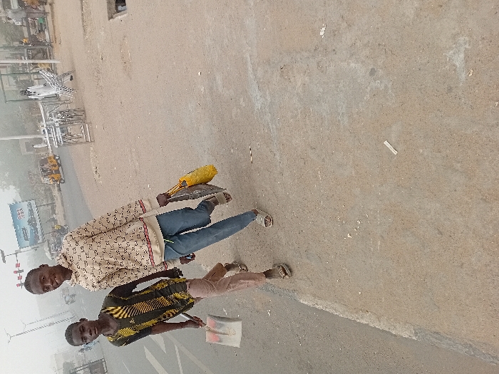 The image portrays an urban street scene in Sharada, Nigeria, characterized by a hazy atmosphere. In the immediate foreground, two males walk generally towards the camera on an unpaved, dusty ground surface adjacent to an asphalt road. The younger male on the left wears a black and yellow striped short-sleeved top, light brown trousers, and sandals, carrying a rectangular grey object by a handle in his right hand. The older male on the right wears a light-colored hooded sweatshirt with a repeating pattern, blue jeans, and light-colored sandals, carrying a dark bag and a yellow bag in his right hand. Both individuals have dark complexions and are looking directly towards the viewer; the individual on the right is smiling. The ground transitions from an asphalt road on the left, marked by a faded white line, to a sandy-colored, unpaved shoulder or sidewalk on the right. In the middle ground, on the unpaved area, a person in a white robe walks past several metal structures, possibly street furniture or racks. Further in the background, a road intersection is visible with traffic lights, utility poles, and a large billboard displaying vehicle advertisements. Multiple three-wheeled auto-rickshaws and other vehicles are present on the road. An open manhole or drain is observed in the lower right section of the unpaved ground. Small pieces of litter are scattered on the dusty surface.